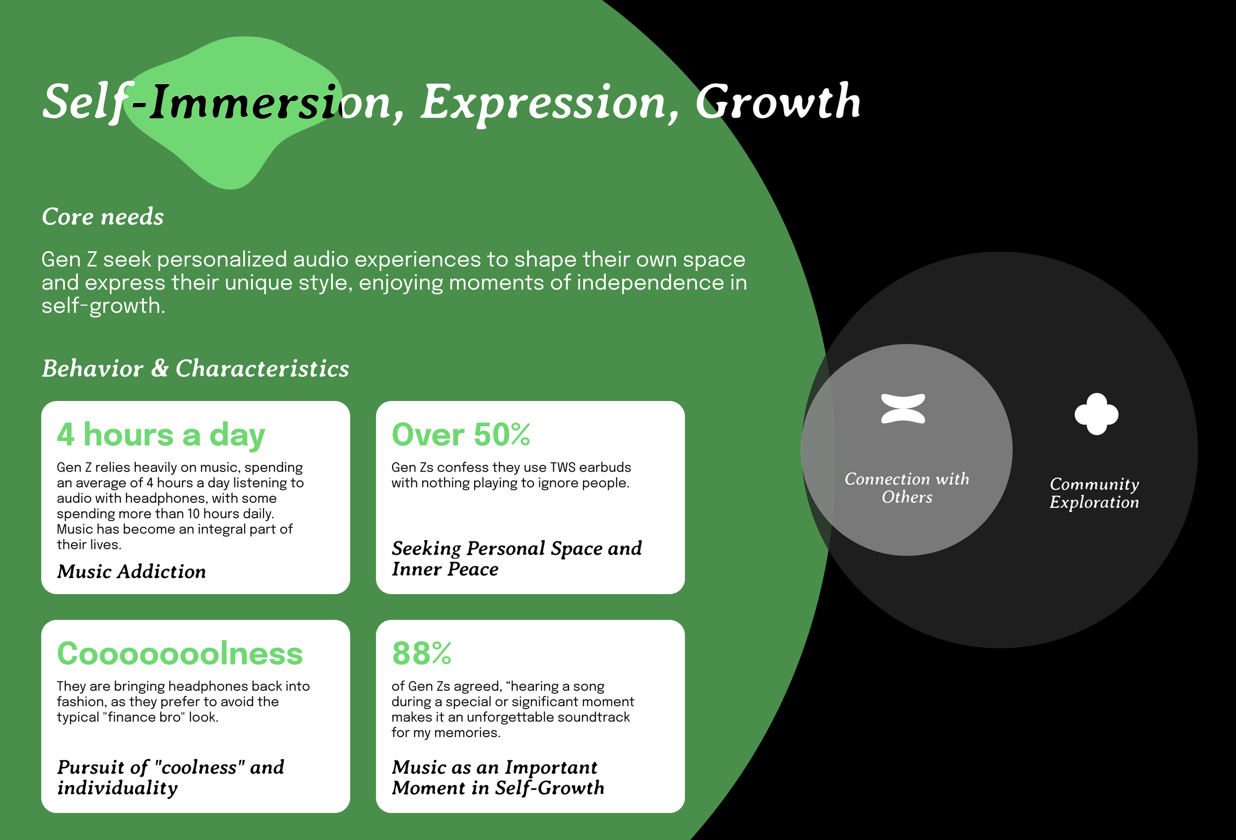 Based on Gen Z's lifestyle values and consumption preferences, I divide their listening experience behavior into three main categories: Self-immersion, Connection with others, and Community exploration.